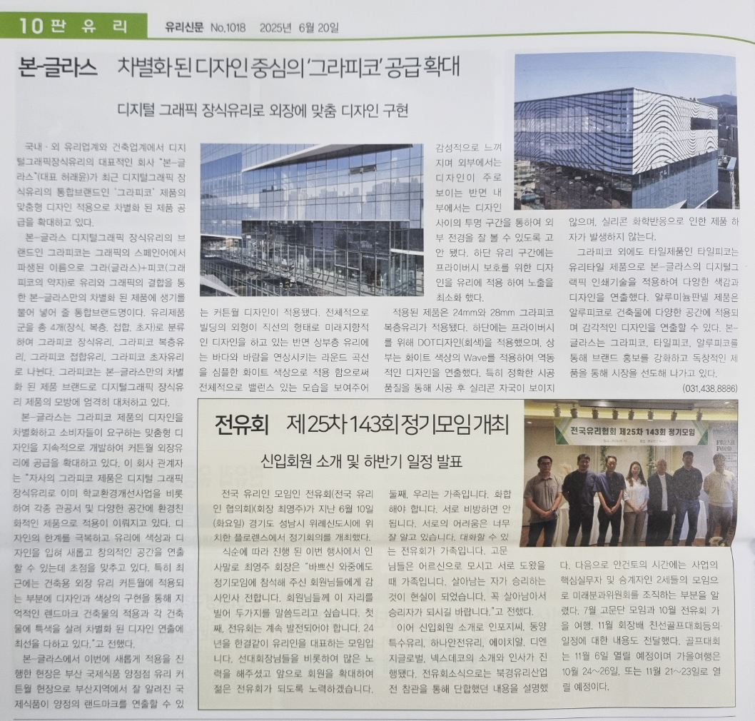 국내/외 유리업계와 건축업계에서 디지털그래픽장식유리의 대표적인 회사 "본-글라스"(대표 허래윤)가 최근 디지털그래픽장식유리의 통합브랜드인 '그라피코' 제품의 맞춤형 디자인 적용으로 차별화 된 제품 공급을 확대하고 있다. (생략...) 그라피코는 본-글라스만의 차별화 된 제품 브랜드로 디지털그래픽장식유리 제품의 모방에 엄격히 대처하고 있다. (생략...) 특히 최근에는 건축용 외장 유리 커튼월에 적용되는 부분에 디자인과 색상의 구현을 통해 지역적인 랜드마크 건축물의 적용과 각 건축물에 특색을 살려 차별화 된 디자인 연출에 최선을 다하고 있다."고 전했다. (생략...) 본-글라스는 그라피코, 타일피코, 알루피코를 통해 브랜드 홍보를 강화하고 독창적인 제품을 통해 시장을 선도해 나가고 있다.
